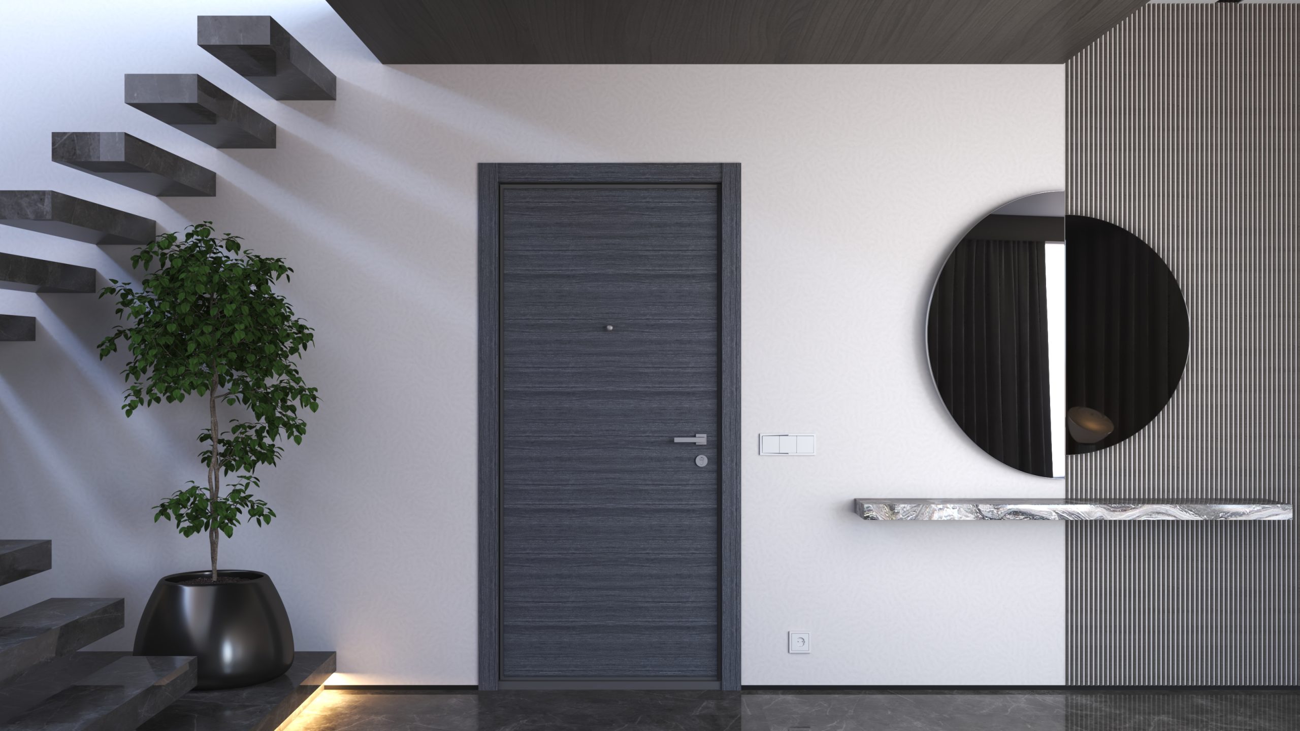 Toc metalic vopsit gri, structură metalică de susținere a panourilor, panouri din MDF laminat, balamale reglabile din oțel, izolație interioară cu vată minerală și puncte suplimentare de închidere pentru rezistență sporită la efracție.